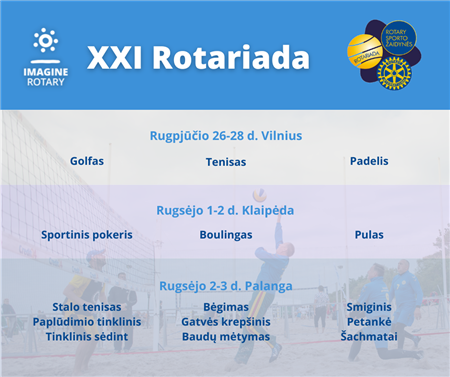 Gera naujiena, kad golfas ir petankė turės neįskaitinę dalį, tad skatiname kuo gausiau dalyvauti rotariečių šeimos narius ir bendraminčius. Pirmą kartą Rotariadoje išbandysime neįskaitinę rungtį padelį, varžysimės labdaringame bėgime „Už švarią Baltiją“ bei savo jėgas išbandysime paralimpinėje rungtyje tinklinis sėdint.